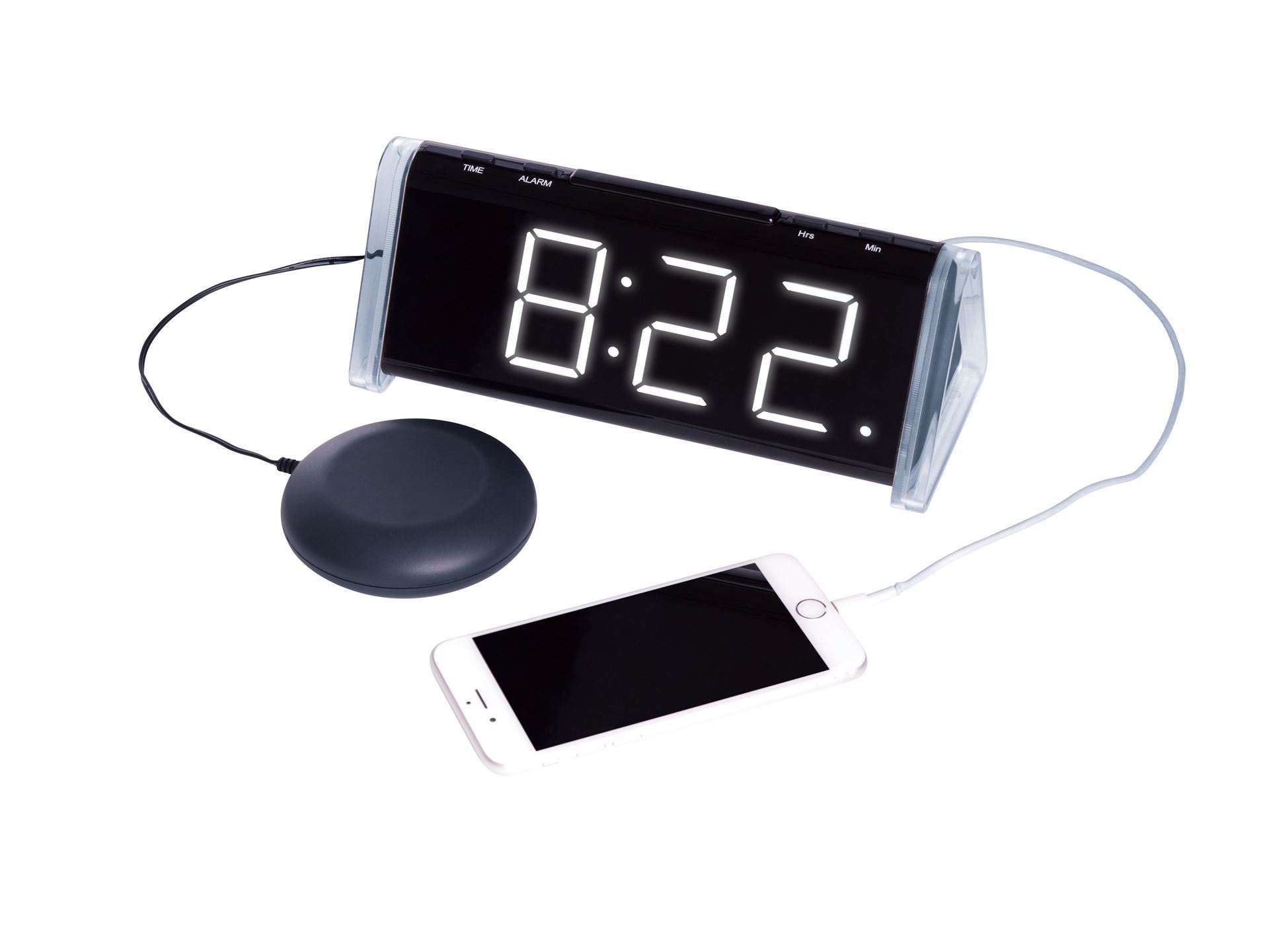 Extra loud, flashing alarm clock with large LED display.